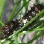Ve středu 6. června jsme objevili na školním záhonku s fenyklem housenku otakárka i my. Taky byla ještě drobná a bez výrazného zbarvení. Skutečná velikost housenek na zvětšených fotografiích je přibližně 8 mm a 4 cm.
