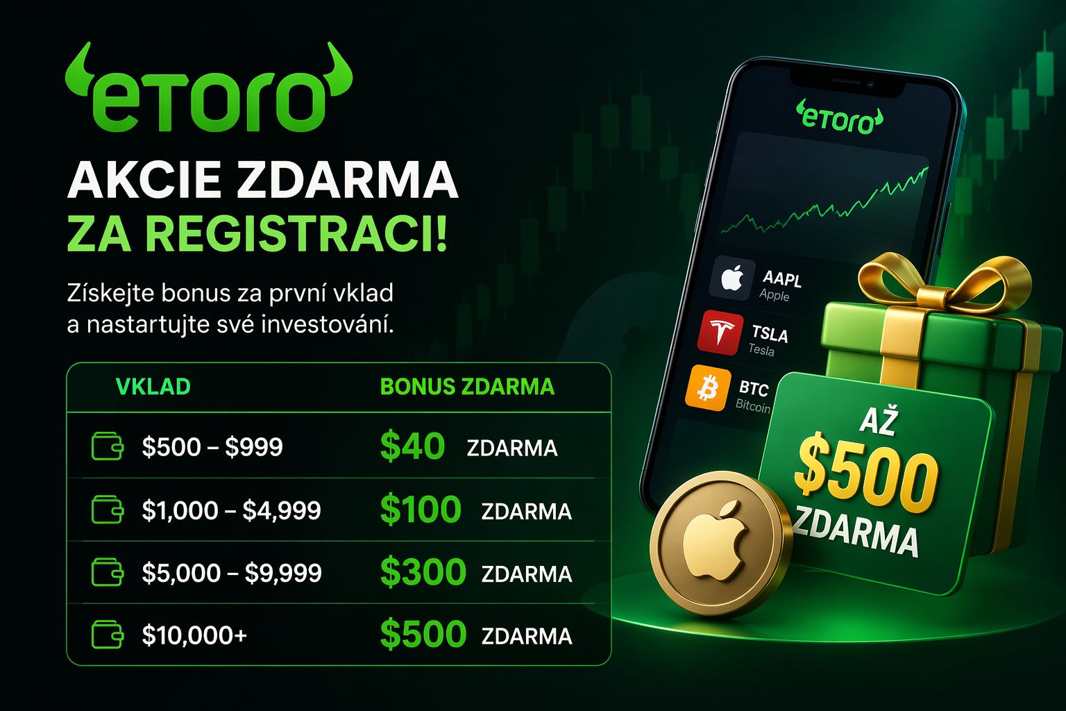 eToro patří mezi nejdostupnější investiční platformy na trhu a díky welcome bonusu může být vstup do světa investování ještě o něco výhodnější. Pokud plánujete začít, může dávat smysl využít aktuální promo nabídku a získat akcie zdarma podle výše vašeho vkladu.