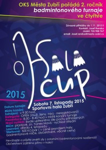 Odbor kultury a sportu města Zubří pořádá 2. ročník badmintonového turnaje ve čtyřhře HALA CUP 2015 Datum turnaje: sobota 7. listopadu Místo konání: Sportovní hala Zubří, Hlavní 492 Zahájení: v 9.00 hodin Kategorie: OPEN (muži, ženy, mix) - neregistrovaní!! Prezentace: 8.00 - 8.45 hodin v místě konání turnaje Hrací systém: ve skupinách, poté dle počtu přihlášených účastníků Míče: plastové, zn. Yonex Mavis,