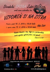 Zuberský ochotnický soubor Divadelní SPONA se opět předvede divákům! Svou novou divadelní hru Vzpomeň si na zítra uvede poprvé v Klubu v pátek 18.3. v 18:00 a pak v sobotu 19.3. v 18:00. Vstupné je dobrovolné. Místenky k rezervaci na telefonním čísle: +420 608 925 552. Těšíme se na Vás!