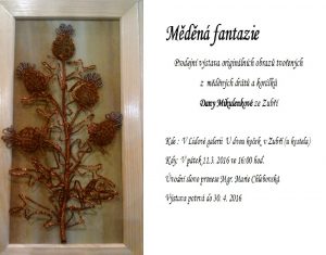 Prodejní výstava originálních obrazů tvořených z měděných drátů a korálků Dany Mikulenkové ze Zubří Kde : V Lidové galerii U dvou koček v Zubří (u kostela) Kdy: V pátek 11.3. 2016 ve 16:00 hod. Úvodní slovo pronese Mgr. Marie Chlebovská Výstava potrvá do 30. 4. 2016