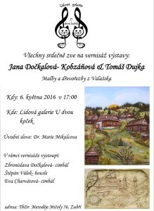 Pozvánka na vernisáž 6.5. v 17:00 hod. výstavy Malby a dřevořezby z Valašska - Jany Dočkalové - Kobzáňové a Tomáše Dujky, potěší každého, kdo má rád ty naše malebné kopečky . Práce obou výtvarníků budou krášlit galerii po celý květen.