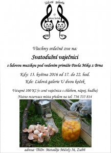 Druhý májový pátek 13.5. v 17:00 hod se pak budeme veselit u Svatodušní vaječnice z vajec domácích a také s výbornými muzikanty - primášem Pavlem Mikem z Brna, Martinem Trančíkem a Josefem Tomanem z Rožnova . Na setkání se těší Eliška Divínová