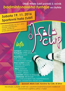 Odbor kultury a sportu města Zubří pořádá 3. ročník badmintonového turnaje ve čtyřhře HALA CUP 2016 Datum turnaje: sobota 19. listopadu Místo konání: Sportovní hala Zubří, Hlavní 492 Zahájení: v 9.00 hodin Kategorie: muži, mix - neregistrovaní!! Prezentace: 8.00 - 8.45 hodin v místě konání turnaje Hrací systém: ve skupinách, poté dle počtu přihlášených účastníků Míče: plastové, zn. Yonex Mavis, rychlost střední Losování: středa 16.
