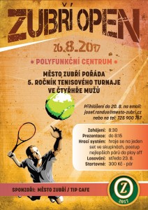 Odbor kultury a sportu města Zubří pořádá v sobotu 26. srpna 2017 5. ročník tenisový turnaj ve čtyřhře mužů Zubří OPEN 2017 Místo turnaje: antukové kurty Polyfunkčního centra Zubří Prezentace: do 8.15 hodin v místě konání turnaje Zahájení turnaje: v 8.30 hod Hrací systém: hraje se na jeden set ve skupinách, postup nejlepších párů do play off Rozlosování: středa 23. srpna Startovné: 300 Kč/pár, kategorie: neregistrovaní muži