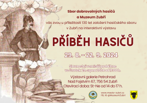 Hasičský sbor v Zubří slaví úctyhodných 130 let od svého založení a při této významné příležitosti vás srdečně zveme na výjimečnou výstavu s názvem "Příběh hasičů", která se uskuteční ve Výstavní galerii Petrohrad. Tato jedinečná expozice vám přiblíží nejen bohatou historii jednoho z nejstarších a nejdůležitějších spolků v našem městě, ale i jeho současnou činnost.
