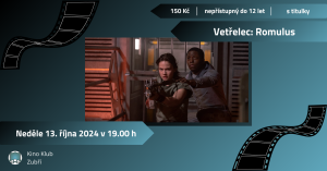 Vetřelec: Romulus navrací fenomenálně úspěšnou franšízu zpět k jejím kultovním kořenům, přičemž představuje zajímavé a neokoukané nové tváře. Při prohledávání opuštěné vesmírné stanice se skupina mladých kolonizátorů setká s nejneúprosnější a nejsmrtonosnější formou života ve vesmíru. A v hlubokém vesmíru nikdo neslyší jejich křik. Vstupné 150 Kč. Nevhodné do 12 let. Vstupenky k zakoupení