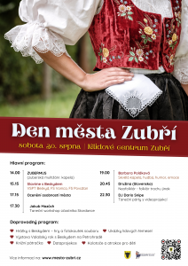 Jako každý rok, také letos se v závěru prázdnin můžete těšit na Den města Zubří. Letošní oslavy patří VSPT Beskyd, kteří slaví 80 let souboru. Doprovodný program proto tvoří především prezentace jejich činnosti. Vedle hudebního programu, v rámci kterého je pomyslnou třešinkou na dortu večerní koncert Barbory Polákové, pro vás místní spolky a firmy připraví jako vždy