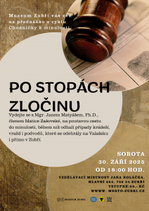 Přednáškový cyklus se po prázdninách vrací!Vydejte se s Mgr. Janem Matyášem, Ph.D., členem Matice Zašovské, na poutavou cestu do minulosti. Odhalíte případy krádeží, vražd i podvodů, které se odehrály na Valašsku i přímo v Zubří.