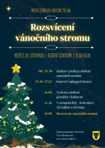 Rozsvícení vánočního stromu Společné setkání v centru Zubří u příležitosti začátku adventního času započne v 15.30 hodin. Po celou dobu akce bude probíhat drobný stánkový prodej a zdobení vánočních stromečků. Od 16 hodin bude probíhat v knihovně tvoření a zdobení perníčků. Program obohatí hudební vystoupení skupiny Unplugged Quartet. Těšit se můžete také na vystoupení Beskyďáčků, dětí z MŠ