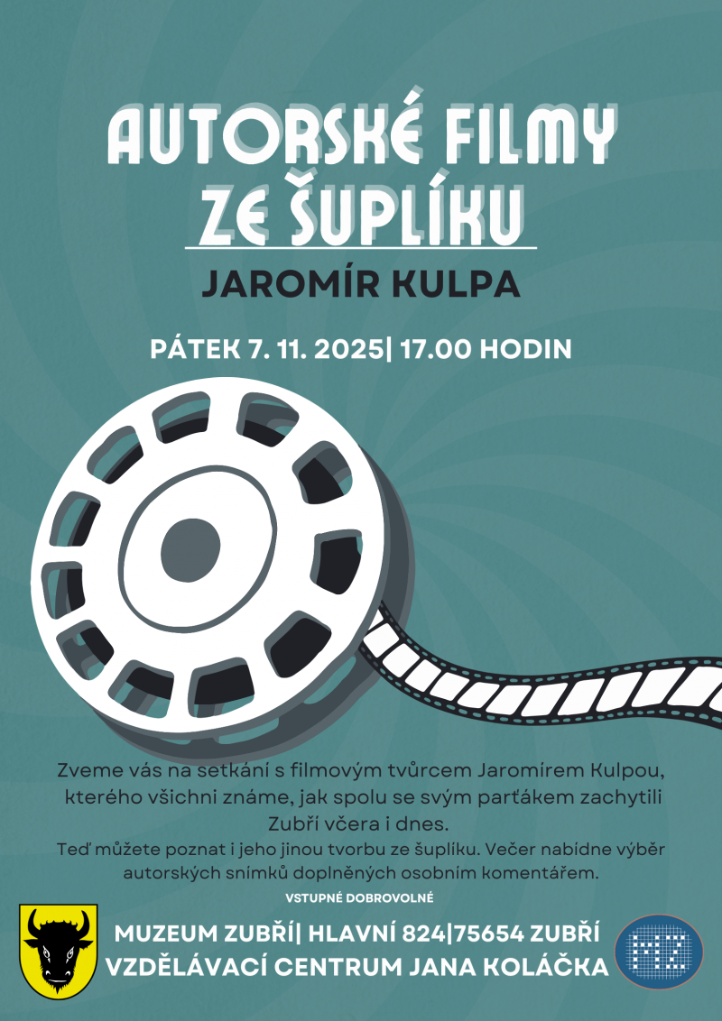 Zveme vás na setkání s filmovým tvůrcem Jaromírem Kulpou, kterého všichni známe, jak spolu se svým parťákem zachytili Zubří včera i dnes. Teď můžete poznat i jeho jinou tvorbu ze šuplíku. Večer nabídne výběr autorských snímků doplněných osobním komentářem.