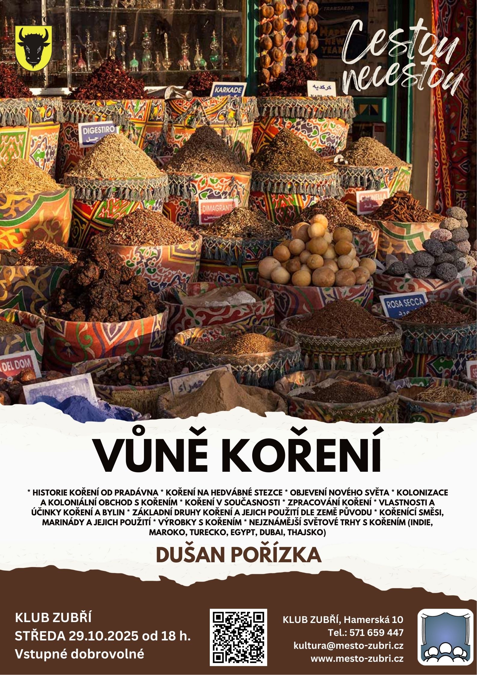 Beseda plná chutí, vůní a příběhů o koření, které po staletí propojuje kultury celého světa. Pro milovníky cestování se od září znovu rozbíhá koloběh přednášek, jež vás prostřednictvím obrázků, promítání a vyprávění pozvaných osobností zavedou do různých koutů celého světa. Cyklus přednášek CESTOU NECESTOU jsme v září “otevřeli” spolu s Valentinou Krejčí návštěvou studené Aljašky. V říjnu vás čeká tak trochu jiné cestování, v rámci kterého se nebudeme věnovat zdaleka jen jedné zemi. Společným atributem tentokrát bude VŮNĚ KOŘENÍ. Vydejte se s Dušanem Pořízkou na dobrodružnou cestu za kořením, kulturou a příběhy vzdálených zemí. – Historie koření od pradávna – Koření na hedvábné stezce – Objevení Nového světa – Kolonizace a koloniální obchod s kořením – Koření v současnosti – Zpracování koření – Vlastnosti a účinky koření a bylin – Základní druhy koření a jejich použití dle země původu – Kořenicí směsi, marinády a jejich použití – Nejznámější světové trhy s kořením (Indie, Maroko, Turecko, Egypt, Dubai, Thajsko)Beseda plná chutí, vůní a příběhů o koření, které po staletí propojuje kultury celého světa. Pro milovníky cestování se od září znovu rozbíhá koloběh přednášek, jež vás prostřednictvím obrázků, promítání a vyprávění pozvaných osobností zavedou do různých koutů celého světa. Cyklus přednášek CESTOU NECESTOU jsme v září “otevřeli” spolu s Valentinou Krejčí návštěvou studené Aljašky. V říjnu vás čeká tak trochu jiné cestování, v rámci kterého se nebudeme věnovat zdaleka jen jedné zemi. Společným atributem tentokrát bude VŮNĚ KOŘENÍ. Vydejte se s Dušanem Pořízkou na dobrodružnou cestu za kořením, kulturou a příběhy vzdálených zemí. – Historie koření od pradávna – Koření na hedvábné stezce – Objevení Nového světa – Kolonizace a koloniální obchod s kořením – Koření v současnosti – Zpracování koření – Vlastnosti a účinky koření a bylin – Základní druhy koření a jejich použití dle země původu – Kořenicí směsi, marinády a jejich použití – Nejznámější světové trhy s kořením (Indie, Maroko, Turecko, Egypt, Dubai, Thajsko)