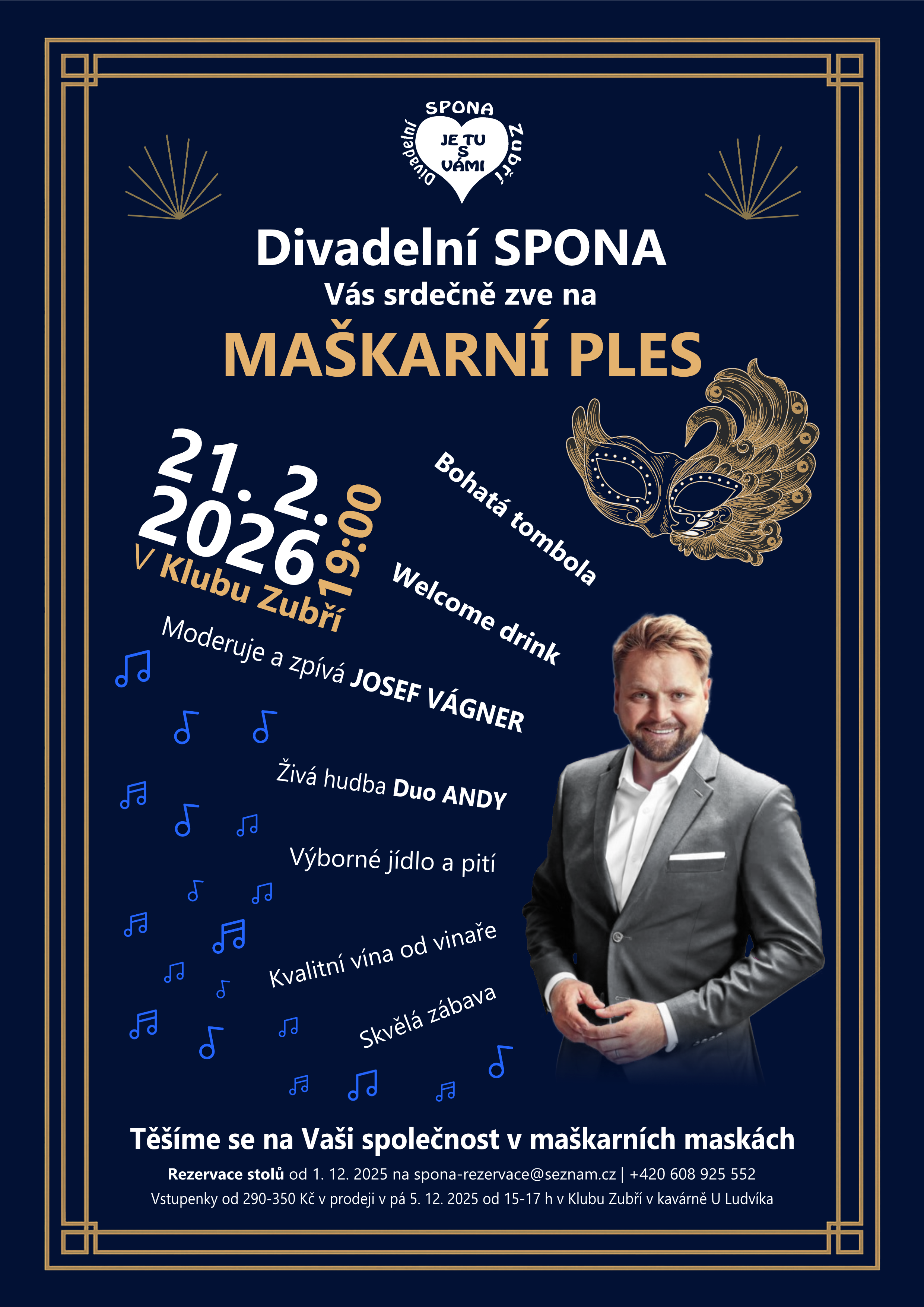 Maškarní ples Divadelní SPONA Zubří, na kterém bude zpívat i moderovat Josef Vágner, český popový a muzikálový zpěvák a herec držitel Českého slavika v kategorii Objev roku, dále zahraje živá hudba Duo ANDY. Čeká Vás zábavný program a bohatá tombola.