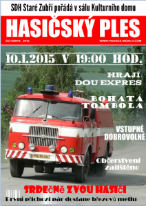 Sbor dobrovolných hasičů Staré Zubří se Vás touto cestou dovoluje pozvat na Hasičský ples, který se uskuteční dne 10.1. 2015 od 19:00 hod. v sále Kulturního domu.