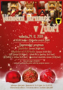 Vánoční jarmark v Zubří sobota 29. 11. 2014 od 10:00 hodin v Klidovém centru Zubří Doprovodný program Dopoledne: Faraoni (10 hod.) Odpoledne od 14.00 hodin: Faraoni (14 hod.) VSPT Beskyd (15.30)) Schola od Sv. Kateřiny (16.15 hod.) MŠ Sídliště (16.45 hod.) Rozsvícení vánočního stromu (17.00 hod.)