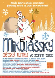Město Zubří a Klub přátel stolního tenisu pořádají dne 6. 12. 2014 od 9.00 hodin Mikulášský dětský turnaj ve stolním tenise   Místo turnaje: Sokolovna Zubří, ul. Hlavní 459, Zubří Prezentace: 8.00 – 8.30 hod v místě turnaje Startovné: 30 Kč Kategorie: nejmladší, mladší, starší žactvo, kluci, dívky, jen neregistrovaní!! Hrací systém: ve skupinách, poté dle počtu přihlášených účastníků, hraje se na pěti stolech Ceny obdrží všichni účastníci turnaje! Upozornění: Každý účastník se účastní turnaje na vlastní nebezpečí! Sportovní obuv a pálku s sebou! Závazné přihlášky do 30.11.2014 !!…