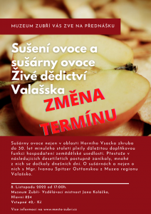 Omlouváme se, ale zítřejší přednáška na téma: Sušení ovoce a sušárny ovoce, živé dědictví Valašska je z důvodu nemoci přesunutá na nový termín. Budeme se na vás těšit úterý 8. listopadu od 17:00 hodin.   Sušárny ovoce nejen v oblasti Horního Vsacka zhruba do 30. let minulého století plnily důležitou doplňkovou funkci hospodaření zemědělské usedlosti. Přestože v následujících desetiletích postupně zanikaly, mnohé z Sušárny ovoce nejen v oblasti Horního Vsacka zhruba do 30. let minulého století plnily důležitou doplňkovou funkci hospodaření…