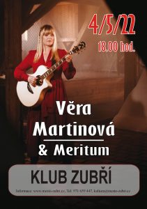 Upozorňujeme na několikrát odložený koncert Věry Martinové. Vstupenky zakoupené v roce 2020 jsou stále platné. Případní zájemci o doprodej volejte 571 659 447 - ideálně týden před konáním akce. Momentálně nemáme volná místa k dispozici. Populární česká zpěvačka, kytaristka a autorka Věra Martinová se skupinou Meritum přijíždí s koncertem právě k vám! Královna české country představí nejen ty nejoblíbenější písně z posledních více než třech dekád, ale také písničky z novinkového alba Meritum. Právě toto album vyšlo během koronavirového období…