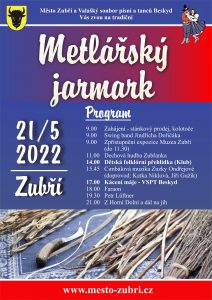 Město Zubří a Valašský soubor písní a tanců Vás zvou na tradiční Metlářský jarmark i s tradičním kácením máje. Metlářský jarmark i s tradičním kácením máje se po pauze vrací zpět. Nejspíš bude méně stánků a méně řemeslníků, než bývalo zvykem dříve, ale věříme, že zábava pod širým nebem vám chybí, stejně jako dětem jejich oblíbené kolotoče. Letošní jarmark se uskuteční v sobotu 21. 5. 2022. Dopoledne bude jeviště za Klubem patřit tradičně velkým místním hudebním tělesům, nejprve Swing bandu Jindřicha Dořičáka,…