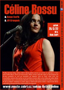 Charismatická francouzská zpěvačka Céline Bossu v doprovodu Romana Vavříka (akordeon, klávesy) a Jiřího Krumpocha (kytara, zvuk). I když zpěvačka Céline Bossu žije a tvoří v Česku již řadu let, duší je stále spjatá se svou rodnou Francií. Své texty píše většinou ve své mateřštině či v angličtině a tematicky se v nich dotýká lásky, radosti, ale i smutku, tedy všeho, co život přináší.V Zubří dvakrát Céline vyprodala kavárnu a okořenila také program Hudebního špízu. Akce se uskuteční ve velkém sálu…